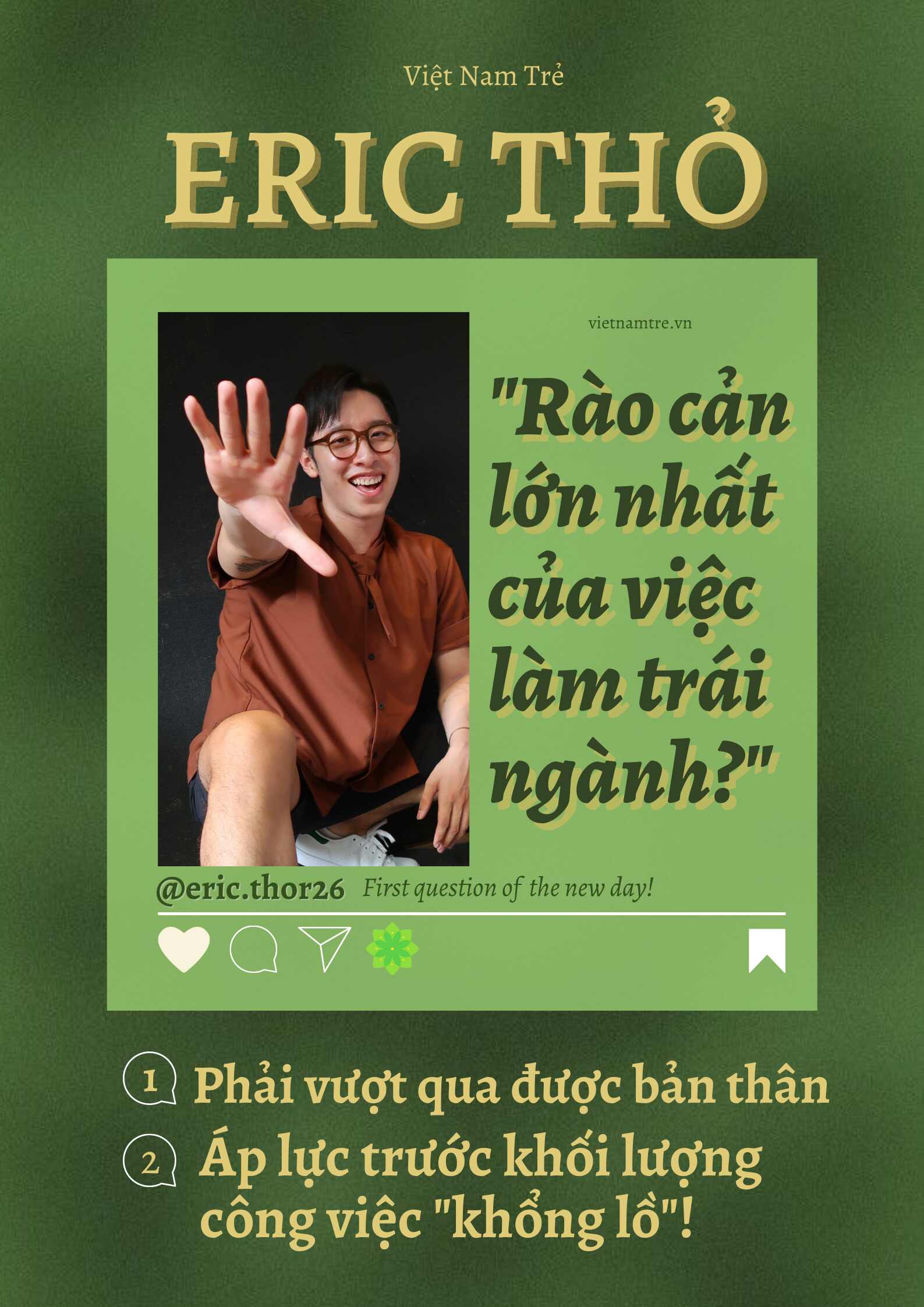 “Eric cảm thấy việc vượt qua được bản thân chính là rào cản lớn nhất. Vì sự hoài nghi về năng lực của bản thân là điều mình thường thấy ở những bạn trái ngành. Ban đầu thì họ có thể dũng cảm bước vào môi trường mới, nhưng rồi lại không đủ tự tin để ứng tuyển hoặc sợ mình không được nhận,..Nhưng các bạn phải dám thử thì mới biết được kết quả ra sao.