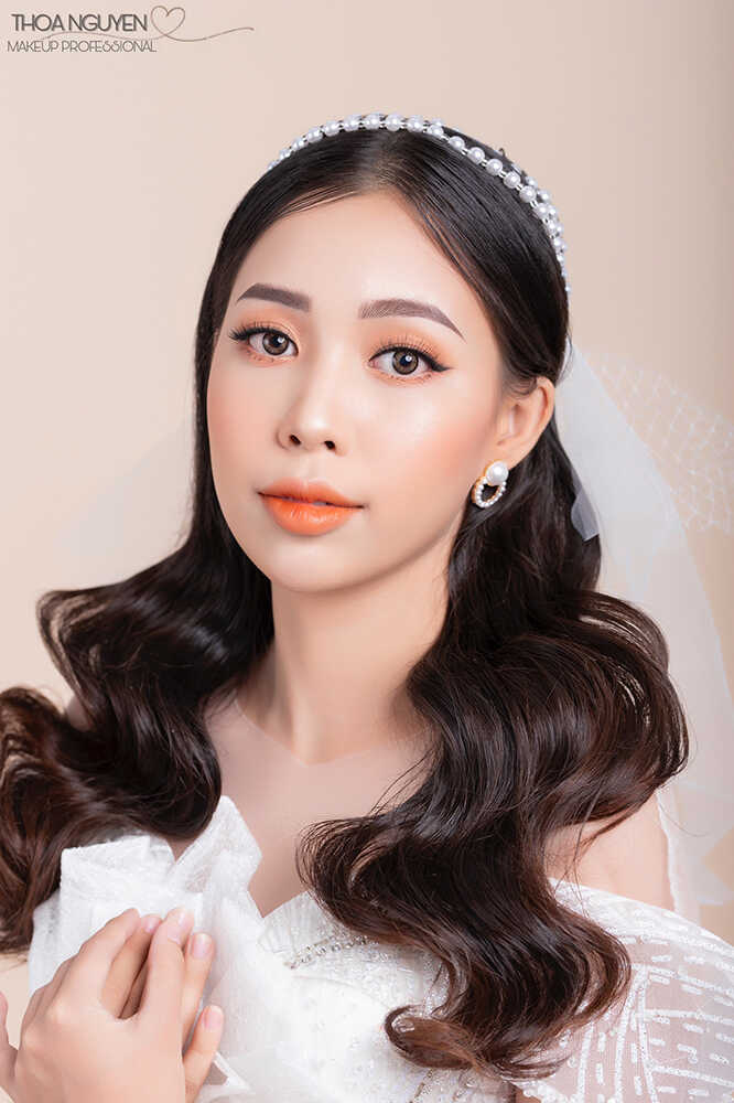 Màu cam đào được Thoa Nguyễn sử dụng chính trong tone makeup này. Đem lại sự ngọt ngào, dịu nhẹ như biến các nàng dâu trở thành công chúa trong chính chuyện cổ tích của cuộc đời mình. Lớp nền nhẹ căng bóng, mi cong vút tự nhiên, màu son nhẹ nhàng bay bổng. Thoa Nguyễn như đang kể chuyện trên chính tác phẩm makeup của mình. Tone makeup này chắc chắn sẽ làm siêu lòng các nàng dâu dù là khó tính nhất.