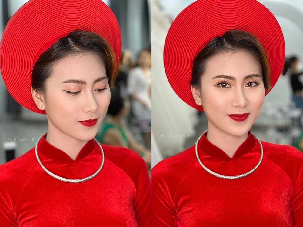 Ưu tiên lối makeup tự nhiên trong trẻo nhưng cũng không kém phần nổi bật. Tại đây sự kết hợp tuyệt vời giữa nhiều gam màu trung tính đep lại sự trẻ trung, thanh lịch cho các nàng dâu. Yến Wedding luôn vận dụng tay nghề một cách khéo léo từ màu son cũng được lựa chọn kỹ càng phù hợp với tone makeup đem lại sự tươi tắn đôi môi căng mọng, quyến rũ. Yến Wedding cũng chú trọng đôi mắt nhẹ nhàng, trong trẻo có hồn cùng hàng mi dài cong, tôn lên chiều sâu cho đôi mắt.